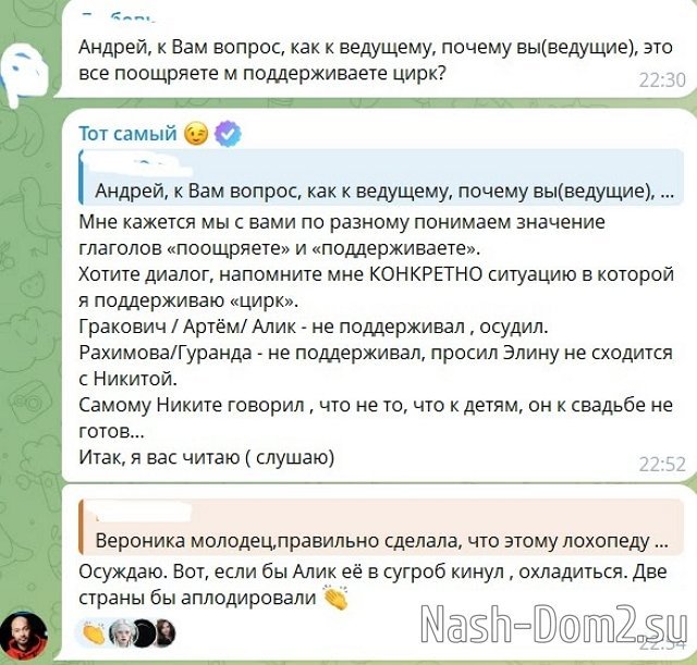 С точки зрения Андрея, Артём Гавришов исчерпал все возможности оставаться на Доме-2 и иммунитетов для него у ведущих не будет. И не факт, что он вернётся на телестройку. Здесь и сам Артём может не захотеть возвращения, ведь на проекте начался период драк и рукоприкладства. Зайдёт на Поляну Гавришов, когда участникам распускать руки запретят?
