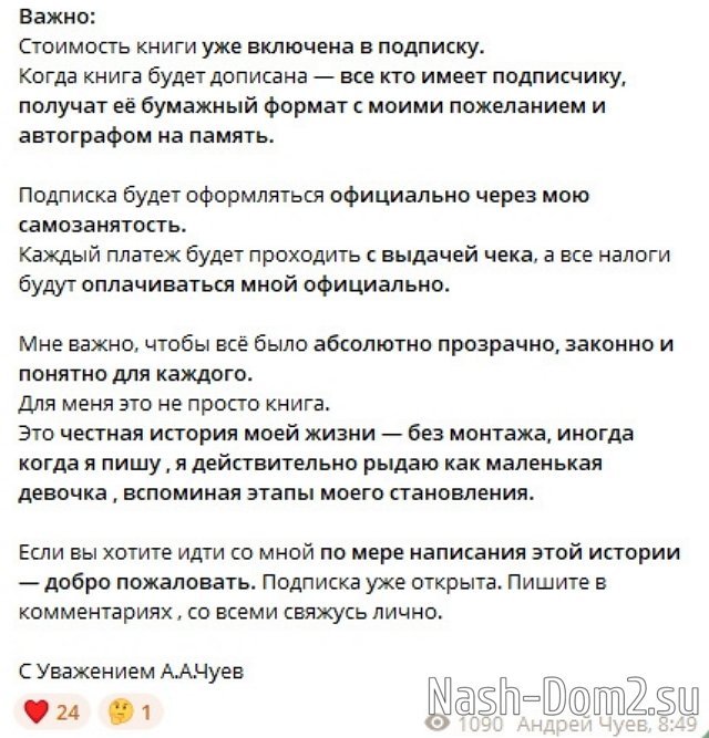 Экс-участник Дома-2 Андрей Чуев известен своими многочисленными проектами по зарабатыванию денег. На этот раз он решил монетизировать свою автобиографию. И, как оказалось, многие его поклонницы готовы раскошелиться, чтобы почитать его ироничное и душещипательное творение.