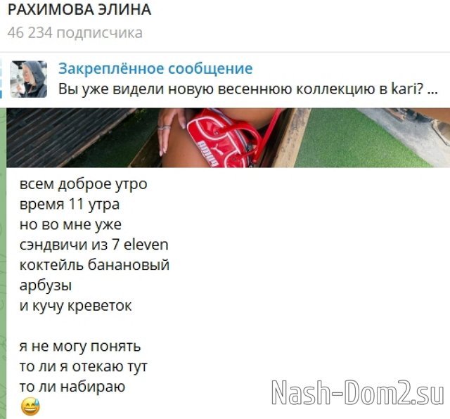 Отдыхающая в Таиланде бывшая участница Дома-2 услышала критику подписчиц, считающих, что у неё сильно изменилась фигура. Девушке уже прогулы ставят на поляне, а она всё выжидает, когда последние участники разбредутся в разные стороны. Многие парни, "выгнавшие Элину" ушли с проекта, но появились Сергей и Женя Хорошевы.