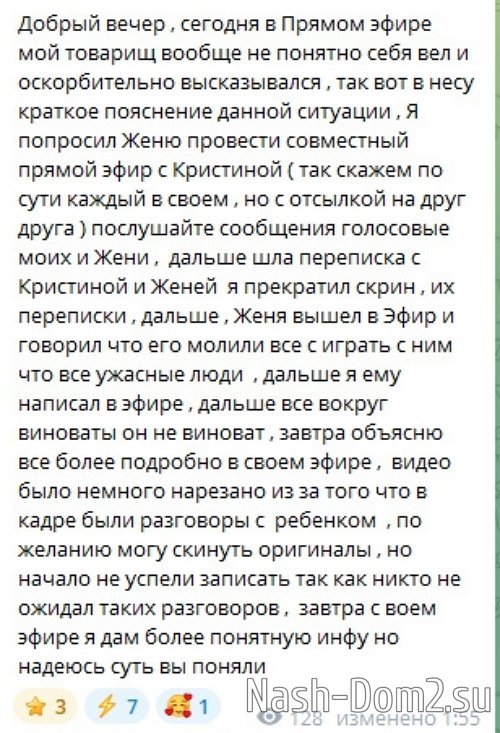 Выяснилась причины ссоры друзей Евгения Кузина и Ивана Барзикова. Бывшие участники Дома-2 поссорились из-за Кристины Бухынбалтэ. Иван попросил Женю поддержать Крис на сайте знакомств "ДВ", где она пыталась заработать больше донатов и ей нужен был баттл с Женей в прямом эфире. Женя спросил у самой Кристины, почему она напрямую его не попросила, а девушка ответила, что не посчитала нужным и это инициатива Вани. Тогда Кузин отказался идти на баттл с Бухынбалтэ, потому что много раз ей проигрывал, и просьбы от неё лично не поступало.