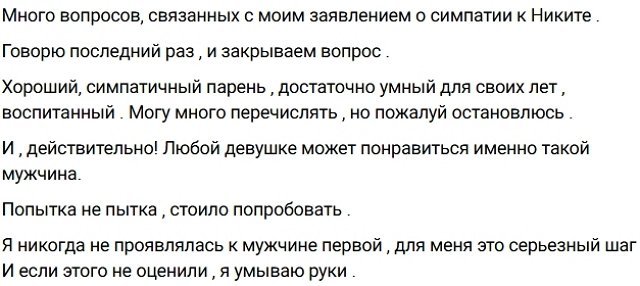 Карина Тетуева призналась своим подписчикам, что ей действительно нравится Никита, нравился, но не получилось его заинтересовать и начать отношения.