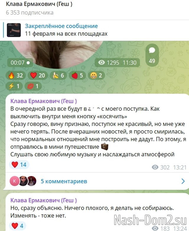 Клава Ермакович считает, что кто-то включил её кнопку "косячить" и запустился режим, который она не в силах остановить. Клавдия сообщила подписчикам, что она натворила дел на Доме-2 и сбежала, временно взяла отгулы, чтобы отправиться в путешествие.