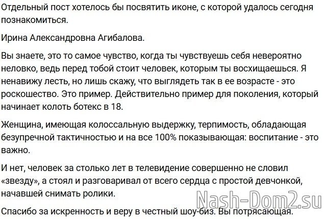 Вчера стало известно, что главный "хейтер" Саши Черно в восторге от знакомства с Ириной Агибаловой. Они то ли на одной передаче пересеклись, то ли в одной гримерке столкнулись. Зрители Дома-2 думали, что Ирина Александровна день рождения внука Мити на Кипре отмечает, а она на Первом Сашу Черно успокаивает и пиарится.