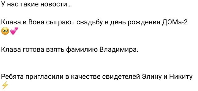 Отношения Клавы и Вовы так стремительно развиваются, что участники Дом-2 решили пожениться в день рождения проекта.